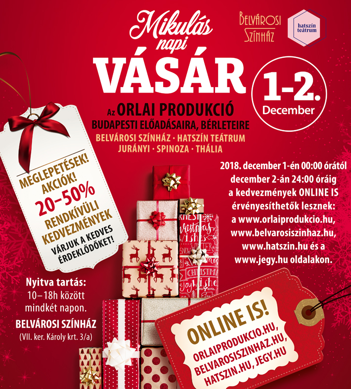 A korábbi évekhez hasonlóan ismét megszervezi Mikulás napi vásárát december 1-jén és 2-án, online és a Belvárosi Színházban az Orlai Produkciós Iroda.