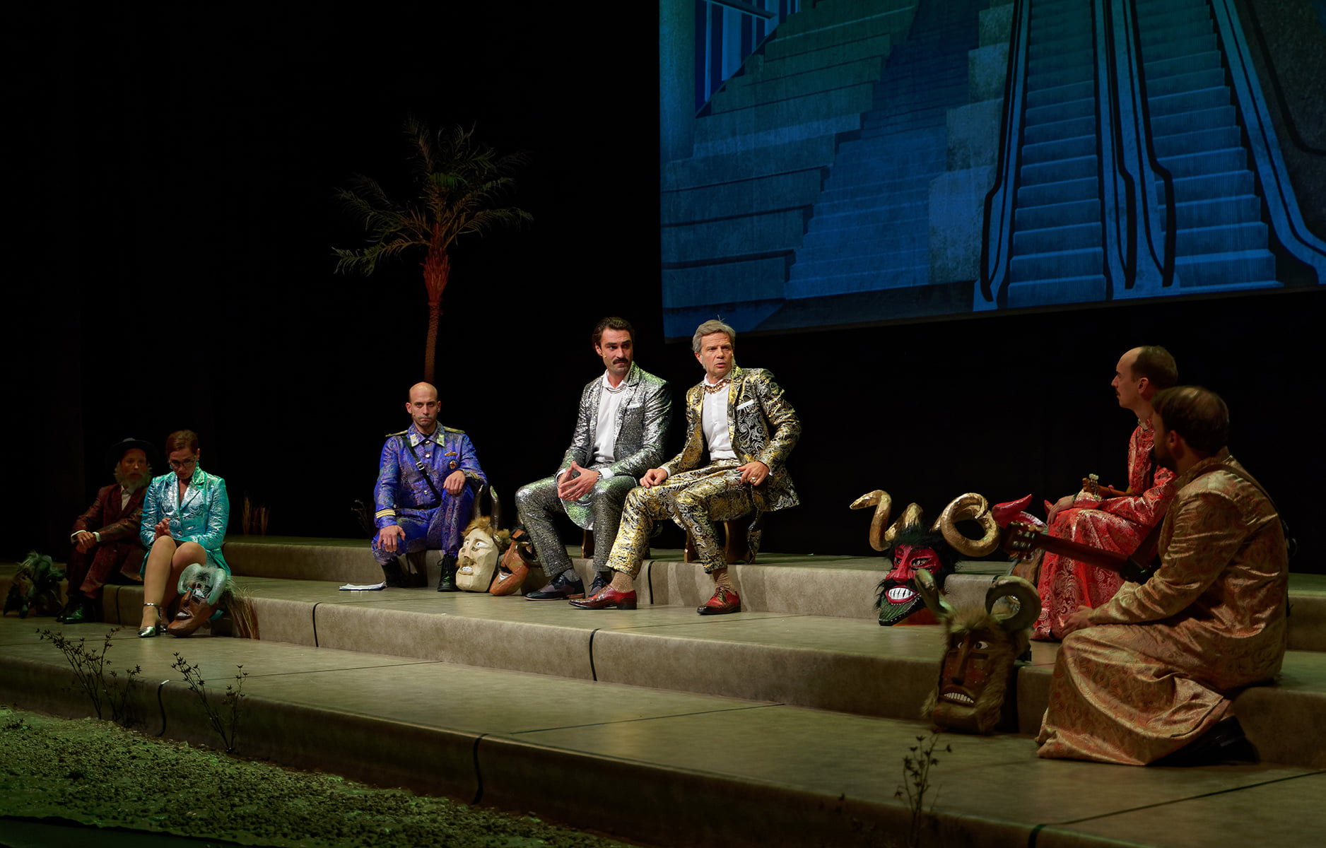 Nem szimplán humorizál (old és ellenpontoz), inkább idézőjelbe teszi, egyben megkísérli önmagukra és ránk is olvasni a darabot.
